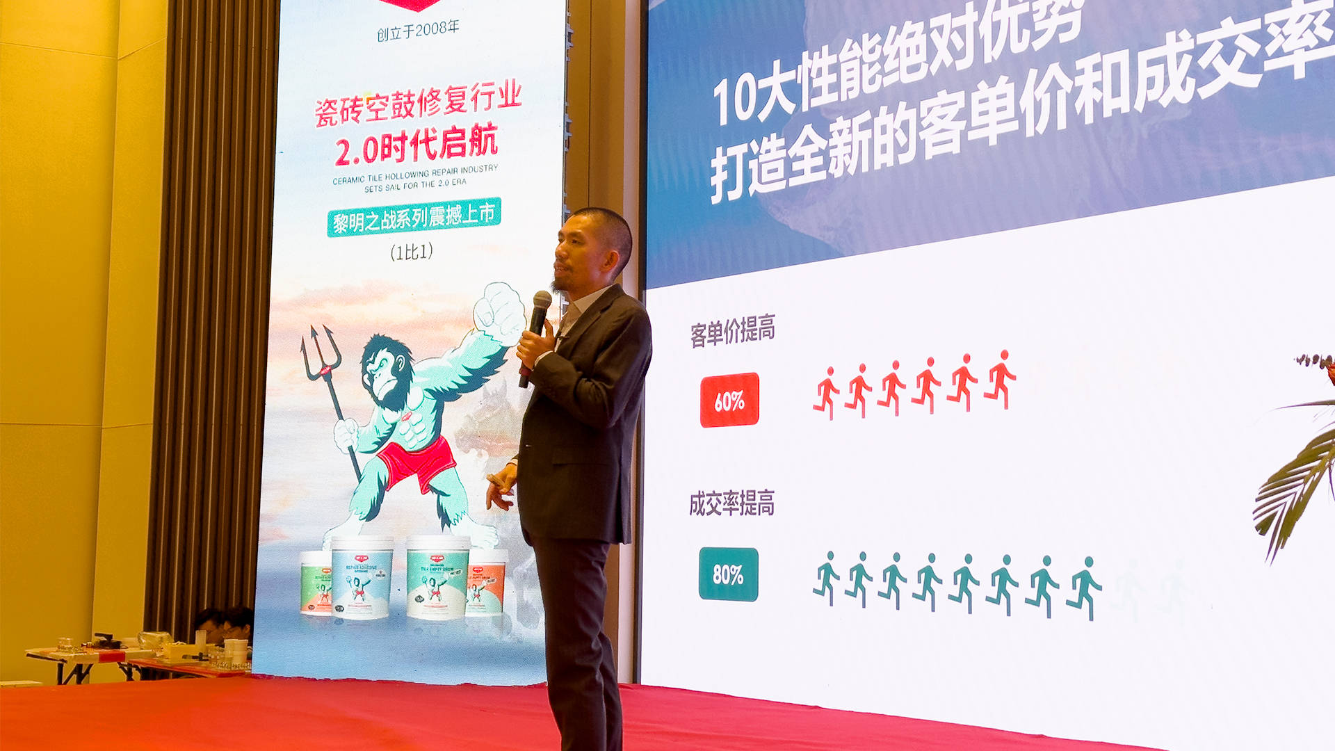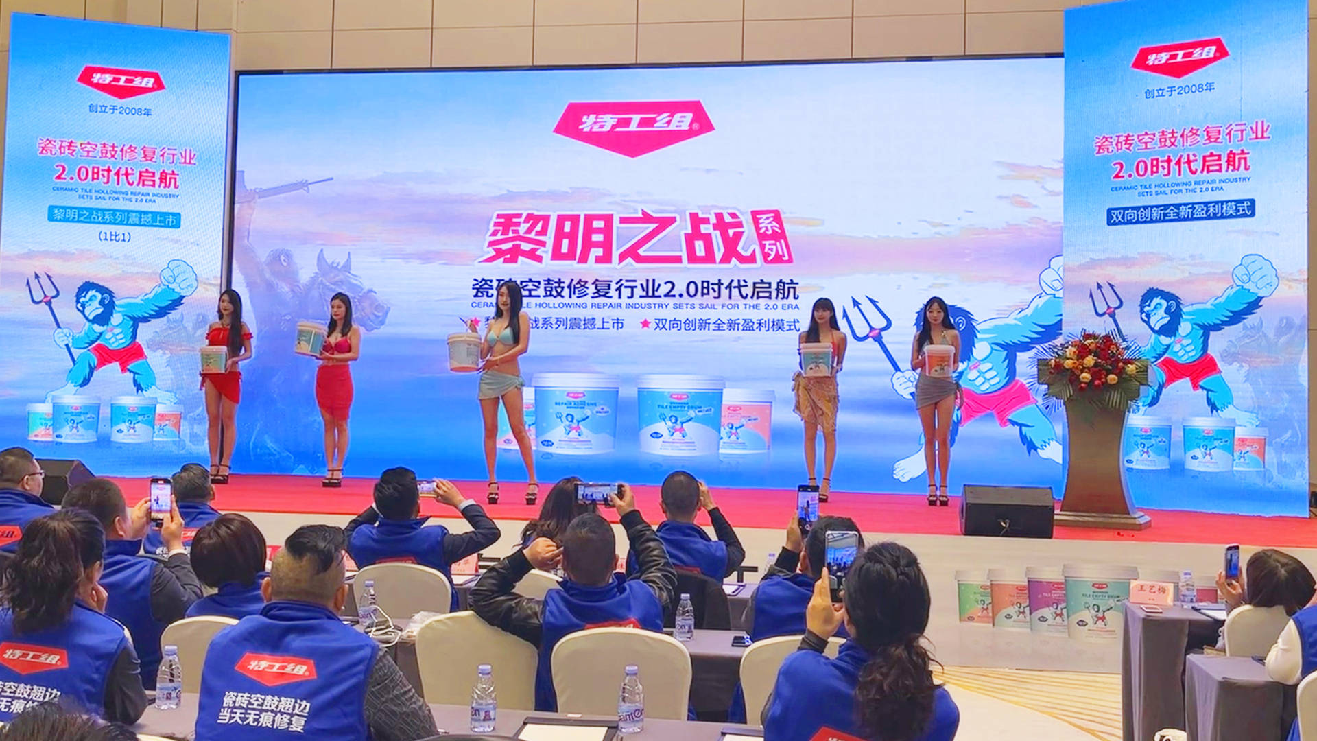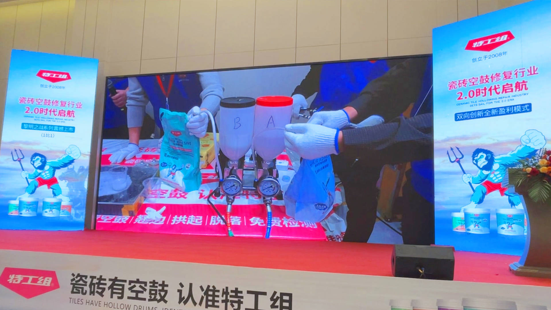 特工组瓷砖空鼓修复胶创始人,技术研发总工程师鲍银俤先生,手持话筒讲述着黎明之战系列的十大核心特点,在摄像机的配合下,实时画面传输至大屏上,行业的困局,在此刻让黎明具象化了。特工组瓷砖空鼓修复胶1:1黎明之战系列,1:1配方,免调胶、施工快、固化快、不膨胀、更环保,一滴胶可承受198kg的拉力,剪切粘结强度高达19.8Mpa,是C1瓷砖胶的39.6倍。此刻,摄像师手中闪耀的镜头与台下千双的目光共同见证黎明的曙光。